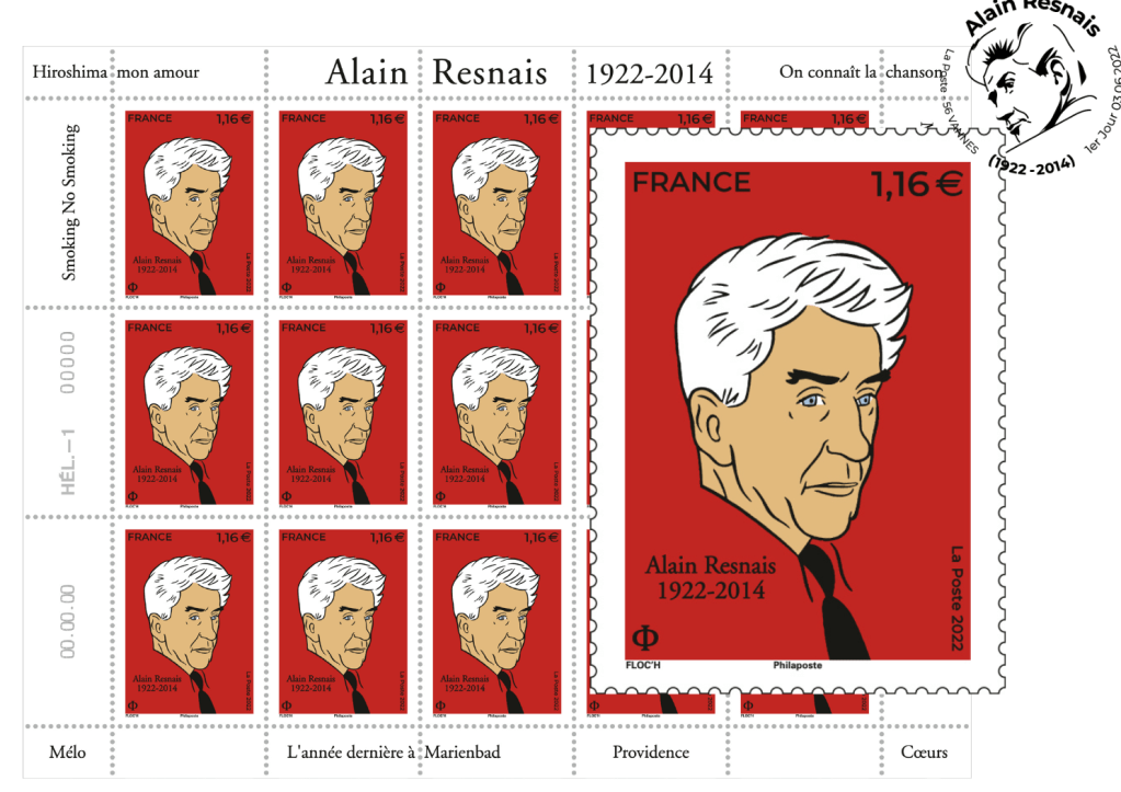 C’est Floc’h qui a créé ce timbre en l’honneur d’Alain Resnais, et qui sortira à 705 000 exemplaires. Alain Resnais, l’ancien élève de l’Institut des hautes études cinématographiques où il entra en 1943 avant de le quitter un an plus tard, fait partie de ces cinéastes français qui l’ont bouleversé à la fin des années 50 le 7ème art. Après son insoutenable Nuit et brouillard, il accède en 1959 au long métrage avec Hiroshima mon amour. On connaît la suite et Alain Resnais a touché à tous les genres avec un talent égal : que ce soit les adaptations théâtrales comme Mélo, No smoking et Smoking ou encore Pas sur la bouche. ou des opus originaux, tel que L’Année dernière à Marienbad, qui révéla Delphine Seyrig; Mon oncle d’Amérique, La guerre est finie… Si un timbre manque à votre collection de cinéphile, il ne vous reste qu’une chose à faire… pour garder un nouveau souvenir du cinéaste disparu le 1er mars 2014 et qui découvrit bien des comédiens… Un artiste qui avait déclaré, non sans malice : « Le cinéma ne devrait être qu’un montage d’émotions. »