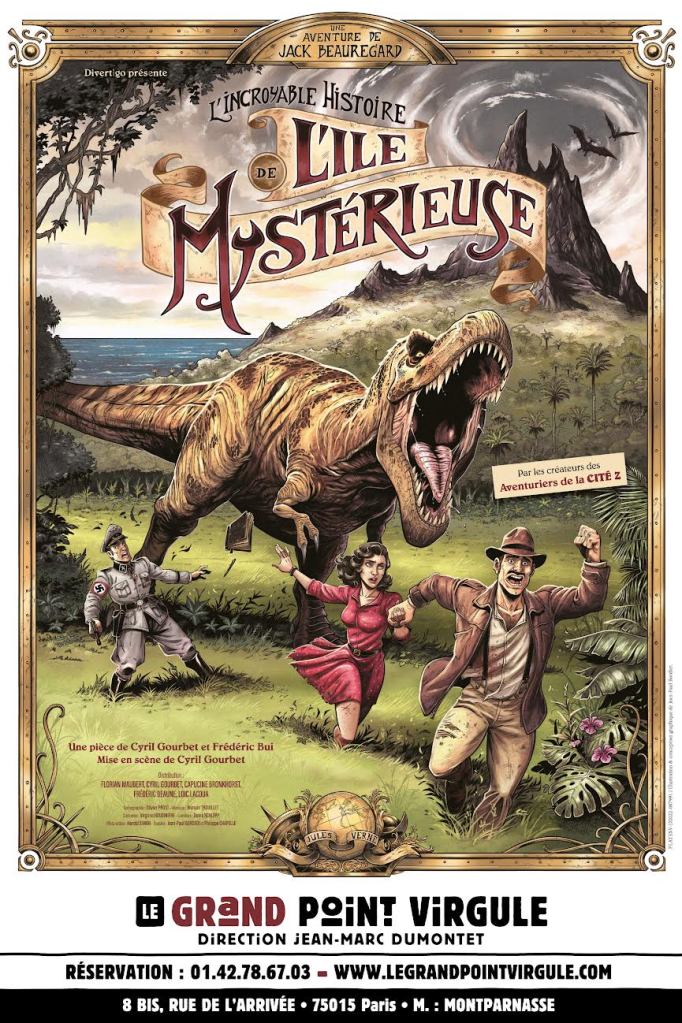 Co-auteur de la pièce, Cyril Gourbet et Frédéric Bui Duy Minh ont misé sur la parodie, façon le Splendid, pour concevoir L’Incroyable Histoire de l’île mystérieuse. Après la réussite des Aventuriers de la Cité Z, jack Beauregard reprend du service en pleine France occupée. Nous sommes en 1942. Escroc mythomane, voleur à la petite semaine, Jack survit grâce au marché noir. Alors qu’une nuit, il croit cambrioler une cave de grands crus de Bourgogne, il tombe nez à nez avec Louise de Talleyrand, une résistante prisonnière de la Gestapo. Parvenant à s’enfuir, Louise révèle à Jack la raison de son arrestation : elle seule est capable de localiser l’île de « Boyuca », qui abriterait, selon la légende, un trésor inestimable : le secret de l’Immortalité. C’est le début d’une aventure où les héros vont devoir braver bien des dangers et affronter même un drôle d’animal…